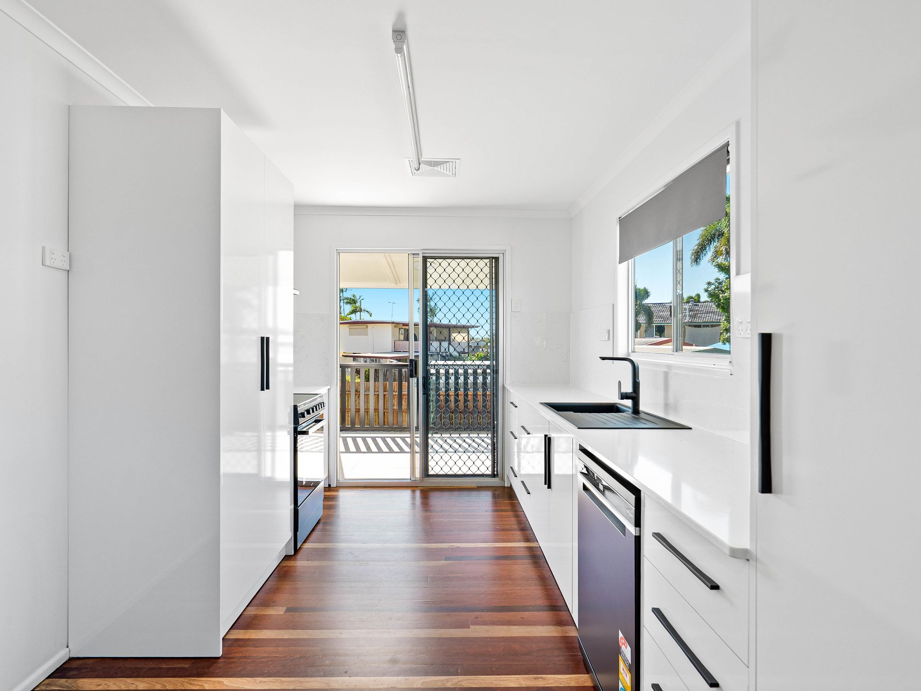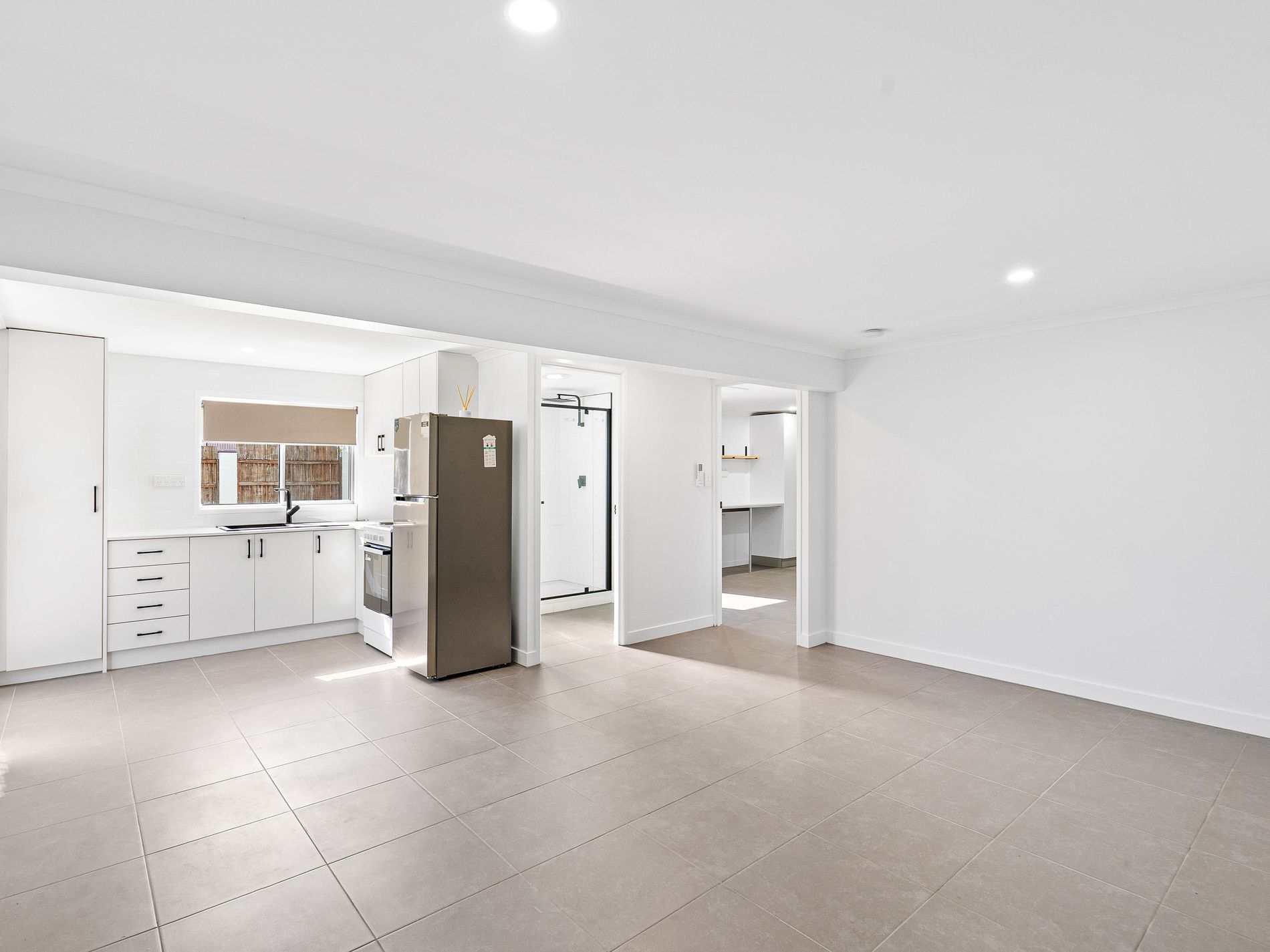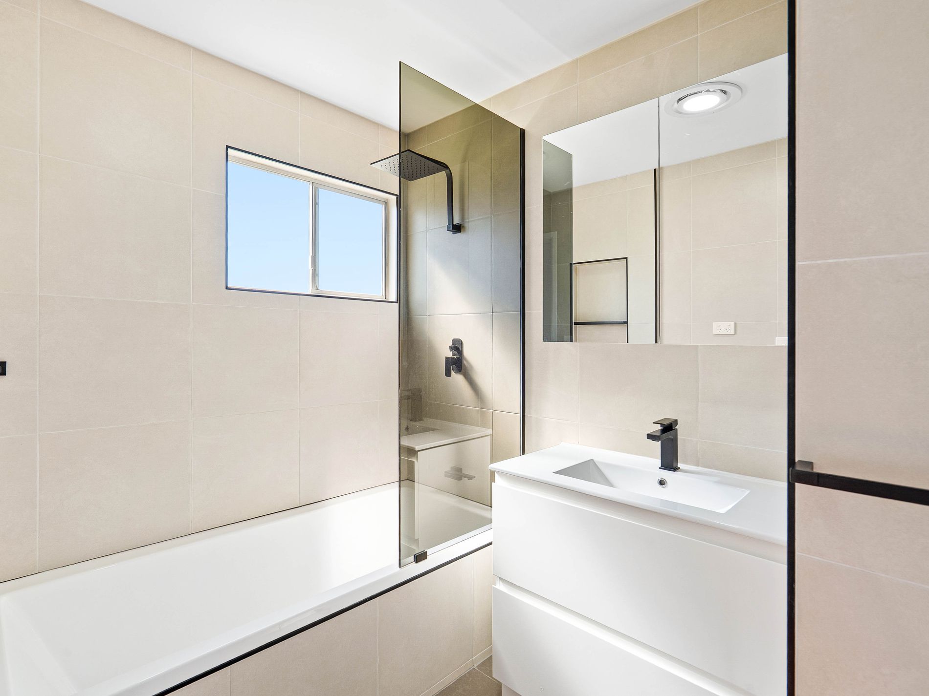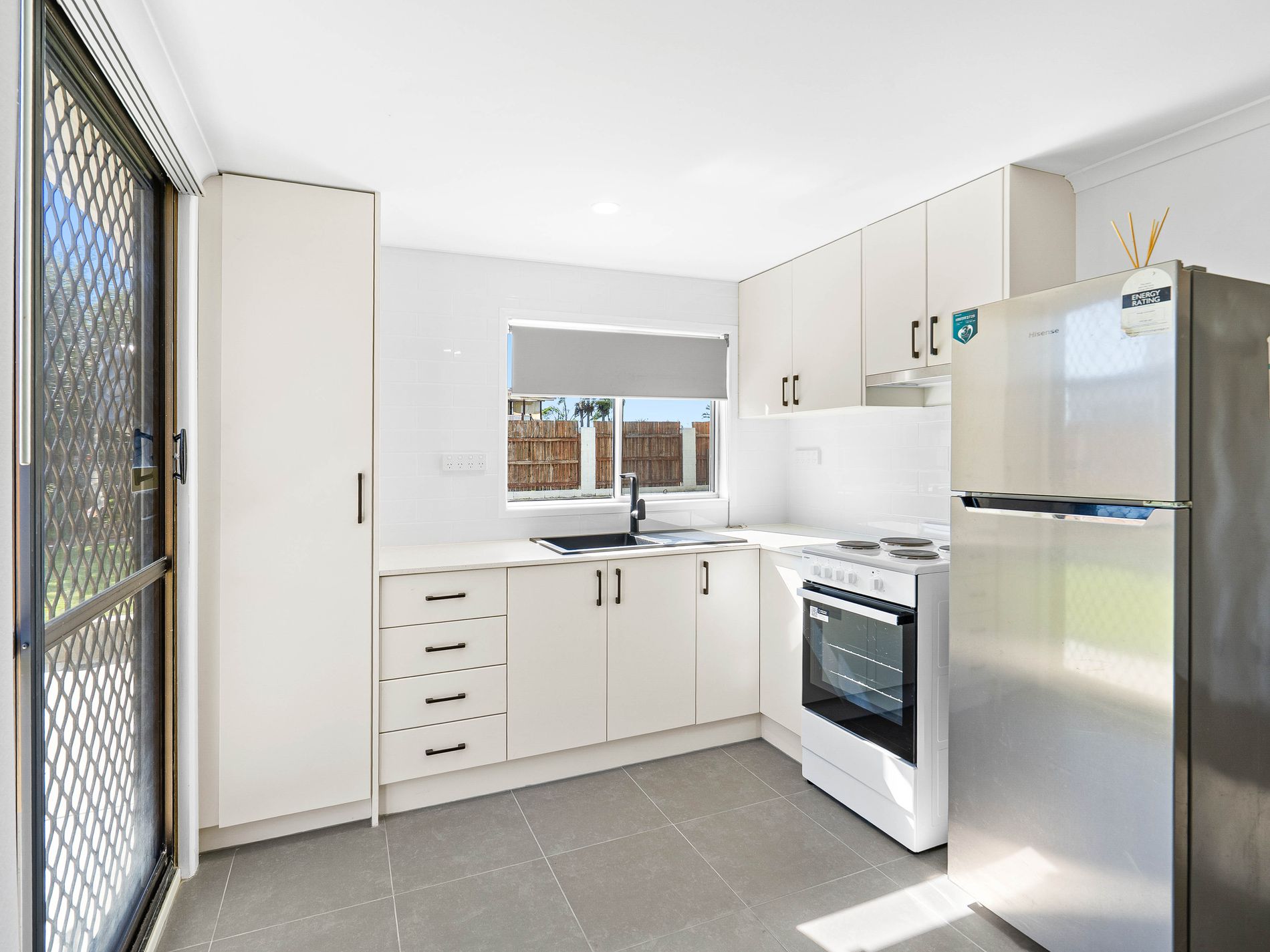 At the heart of the home, the galley-style kitchen combines style and functionality, featuring stone benchtops, electric cooking, a dishwasher and striking black accents that add a modern edge.